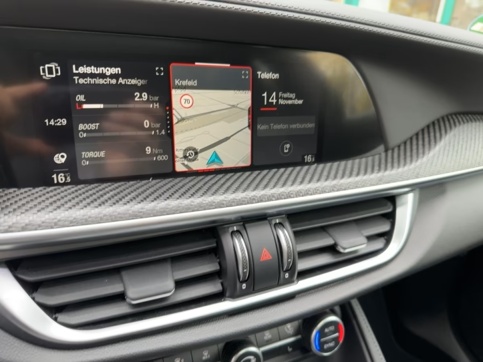 – Volan Quadrifoglio cu buton Start roșu, piele + Alcantara, inserții carbon